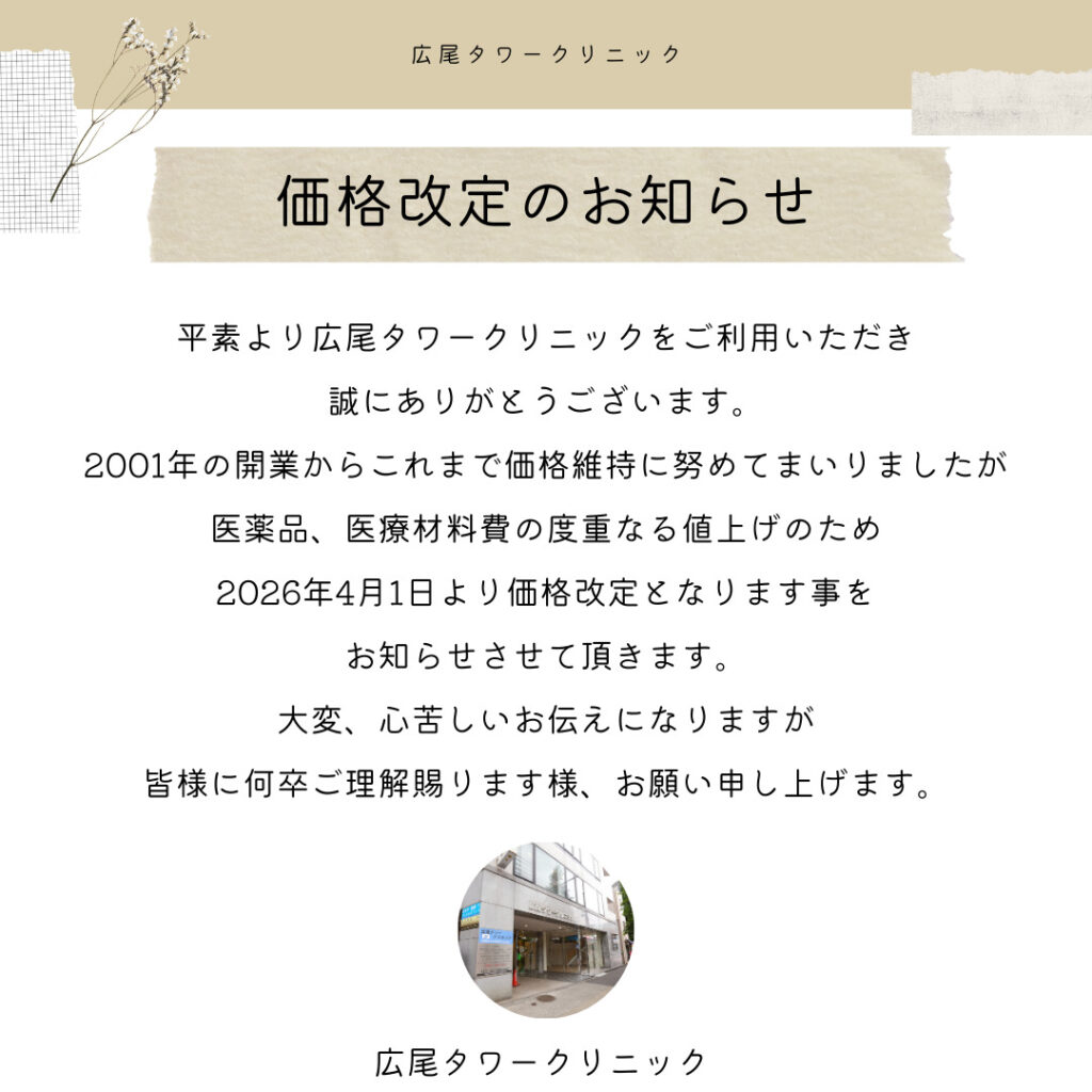 広尾タワークリニックでは、疲労回復や免疫力向上、美容サポートなどを目的とした自費の注射を行っています。にんにく注射やビタミン注射、プラセンタ、美白注射など、目的に応じてご相談いただけます。予約不要で受けられるため、仕事の合間や帰宅前の短時間でも通いやすい点も好評。お疲れを感じたとき、ぜひ気軽にお立ち寄りください。